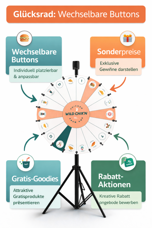 Das Glücksrad Button zeichnet sich durch eine Kombination aus Qualität, Flexibilität und Gestaltungsfreiheit aus, die es ideal für professionelle Einsätze macht – besonders auf Messen und Events.