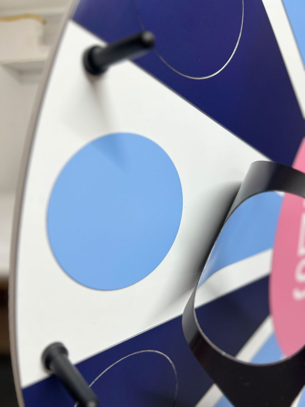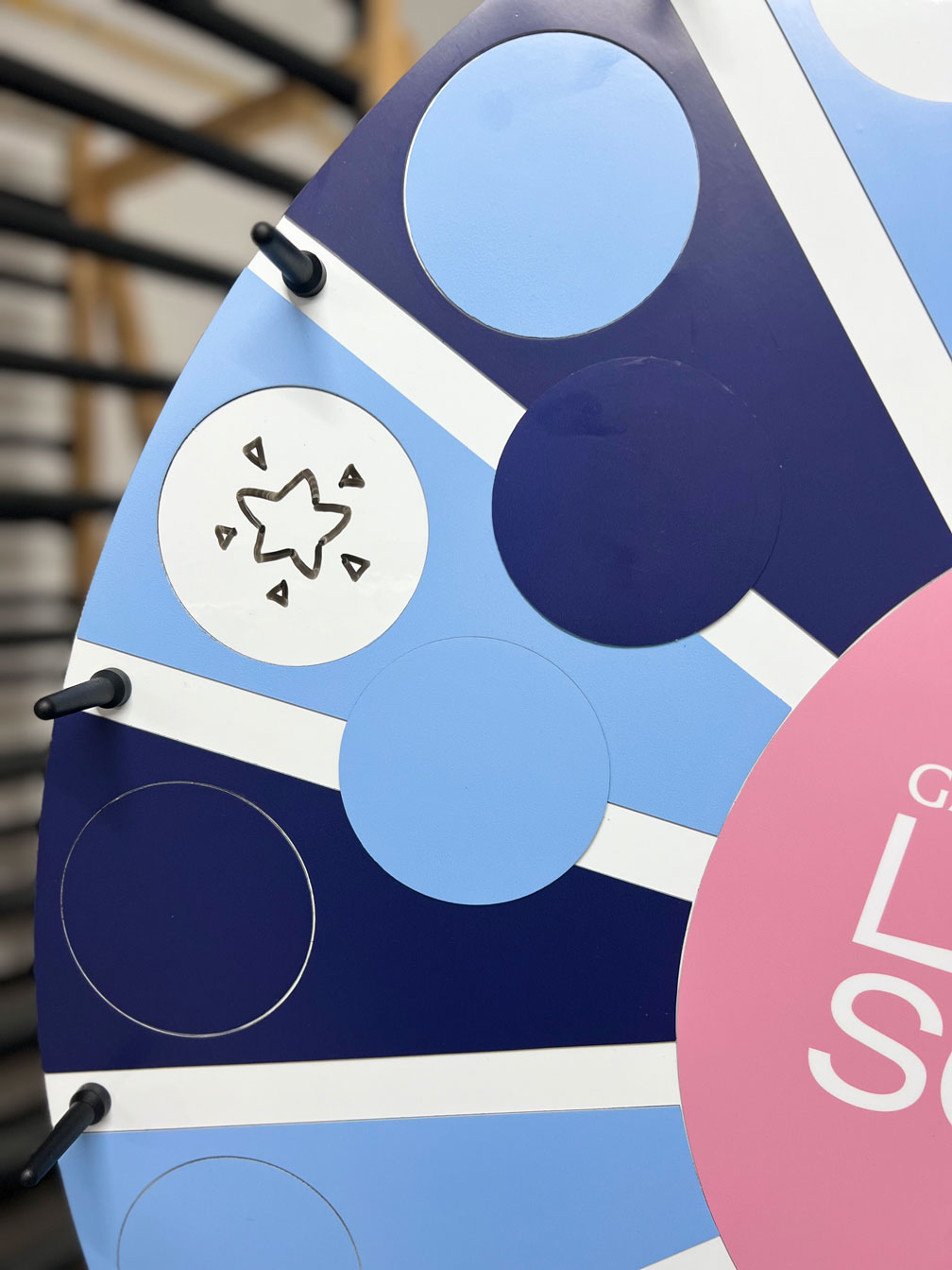 Sie erhalten ein flexibles Glücksrad mit einer Mittelscheibe, wo Ihr Logo sich nicht mitdreht. Somit haben Sie noch mehr Möglichkeiten, Ihr persönliches Glücksrad nach Ihren Vorstellungen zu nutzen.