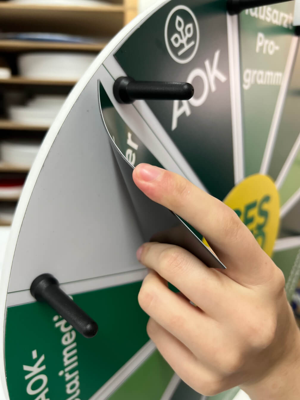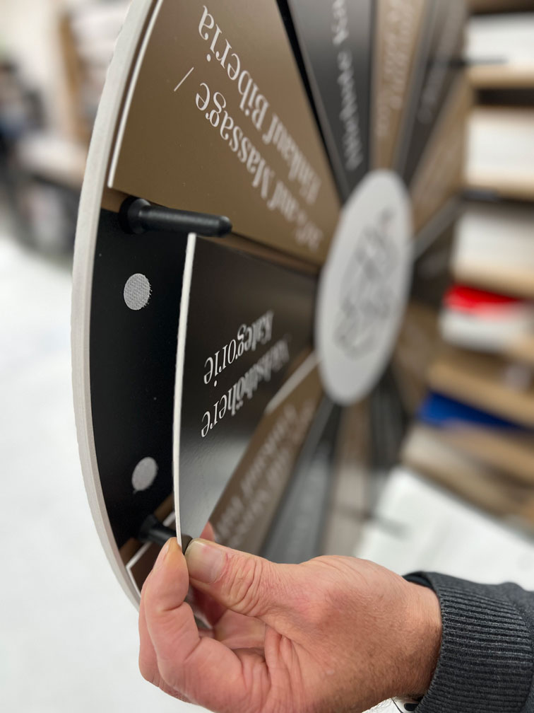 Som producent af lykkehjul tilbyder vi dig naturligvis også muligheden for at redesigne dit ønskede layout for dig eller redesigne det efter dine egne ideer i vores lykkehjulsfabrik. Takket være vores direkte forbundne grafiske afdeling kan vi realisere din idé om et personligt lykkehjul på en målrettet og omkostningseffektiv måde. Du vil altid modtage et prøvetryk til godkendelse, før vi starter produktionen.