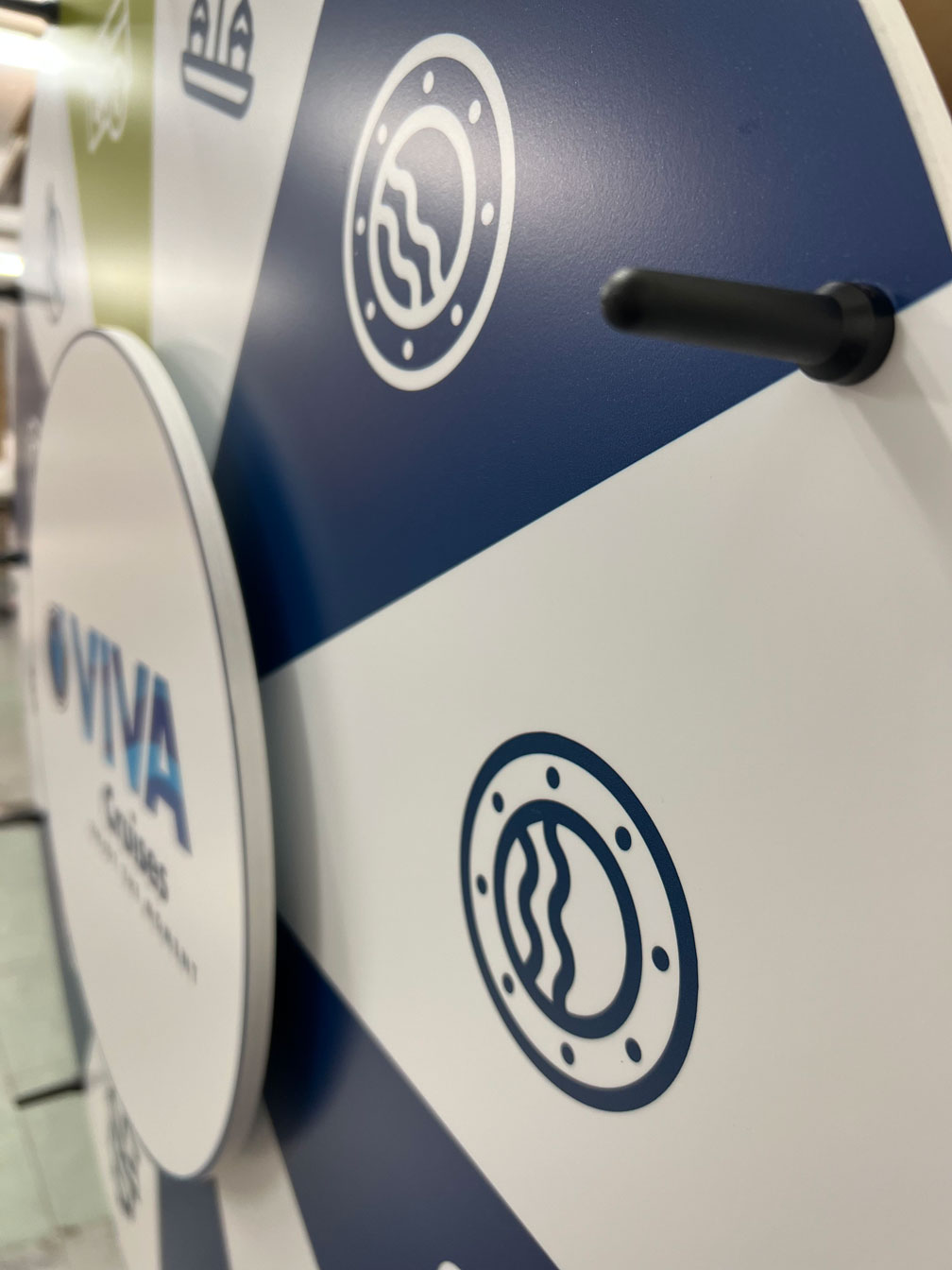 Den forreste skive på det holdbare lykkehjul af meget høj kvalitet er fast, så dit logo ikke roterer med det. Med den faste forreste skive kan du altid holde dit reklamebudskab eller logo klart synligt for alle besøgende.